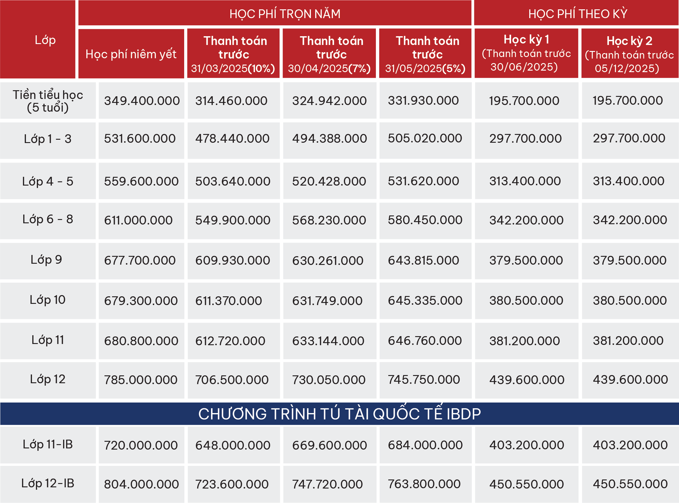 (*) Học sinh học chương trình IBDP sẽ đóng thêm 20 triệu đồng/ năm học cho lớp 11 và lớp 12.