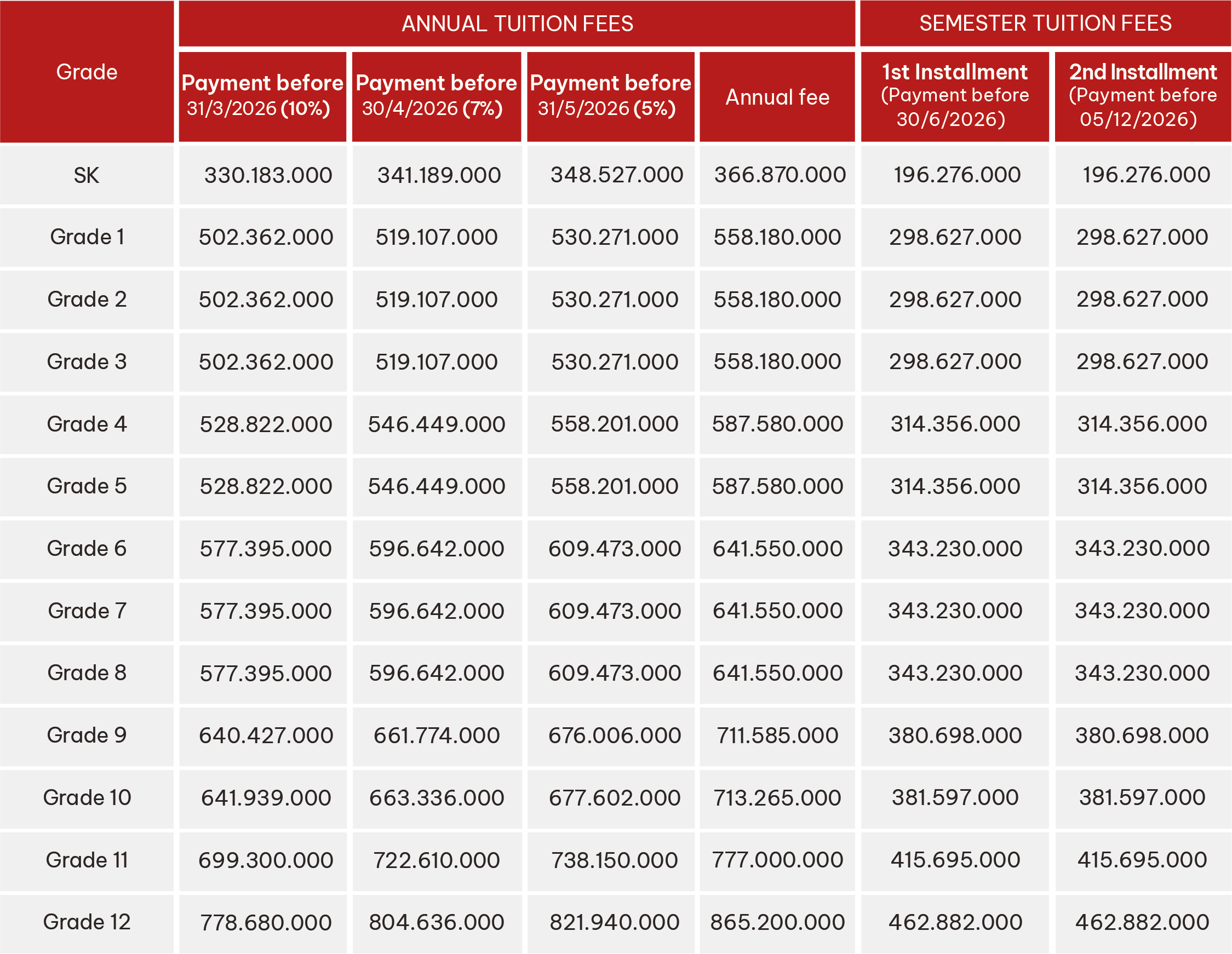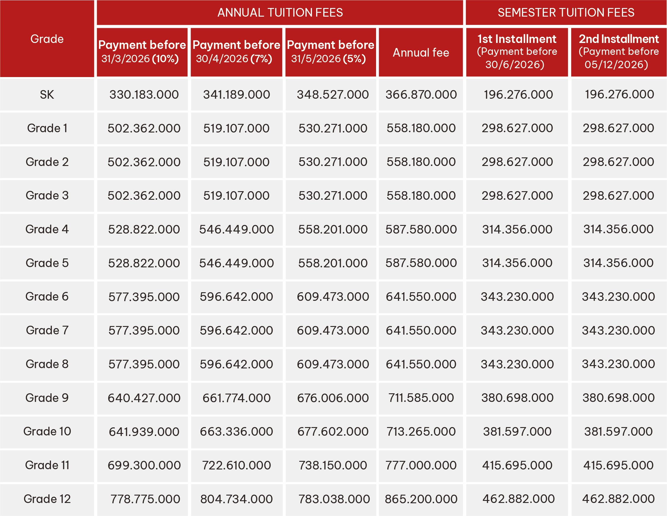 (*) 연간 수업료에는 다음이 포함됩니다: 필수 교과서 전부 이용, 학생 상해 보험 및 동아리 활동.